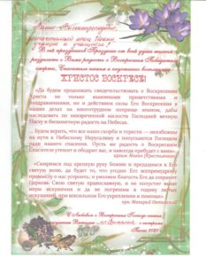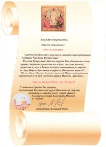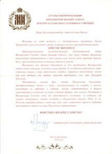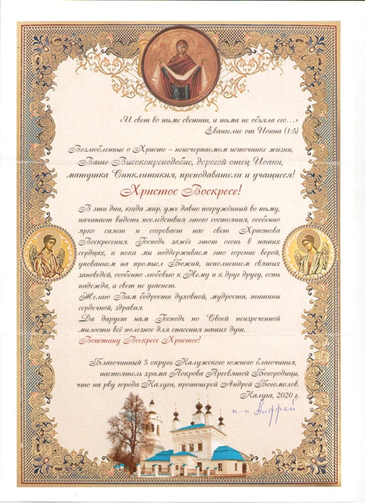В эти светлые дни Духовное училище по подготовке регентов и иконописцев Калужской Епархии Русской Православной Церкви в лице ректора — протоиерея Иоанна Паюла, принимает множественные поздравления с праздником Пасхи. Благодарим всех за теплые слова поздравлений и пожеланий.