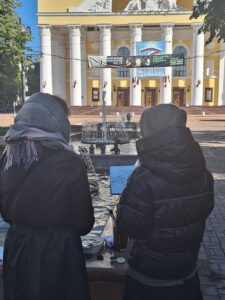 Студенты иконописного отделения с 1-го по 4-ый курс писали этюд городского пейзажа на Театральной площади. По истечении отведённого на это задание времени был проведен мини-просмотр работ для определения вектора творческого развития студентов.
