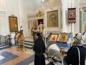 В начале поездки, студенты посетили Казанский женский монастырь. Монахиня монастыря провела экскурсию по монастырю, а также рассказала о преподобномученице княгине Елизавете Фёдоровне. Хор Калужского духовного училища под управлением воспитанницы IV курса Сапарбаевой Татьяны исполнил тропарь, кондак и величание в честь иконы Божией Матери Казанской.