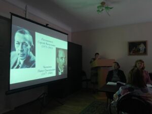 Преподаватель ДШИ № 2 им. С.С. Туликова города Калуги, преподаватель Калужского Духовного училища Соколова Наталья Алексеевна рассказала о духовных корнях, о месте рождения и о преподавателях, которые оказали большое влияние на творчество С.В. Рахманинова. Ее рассказ дополнила и украсила примерами из жизни Сергея Васильевича Рахманинова учитель музыки Средней общеобразовательной школы № 50 города Калуги Финашова Любовь Ивановна.
