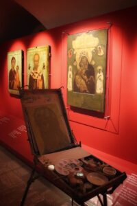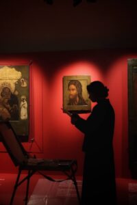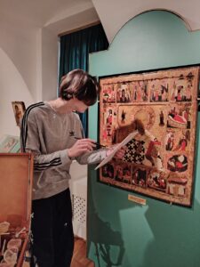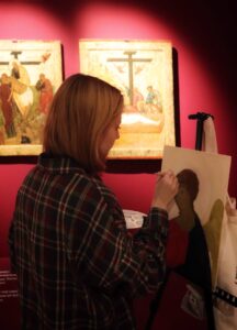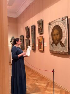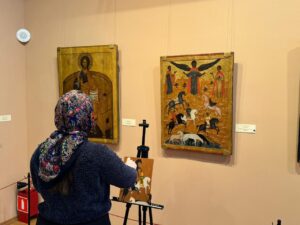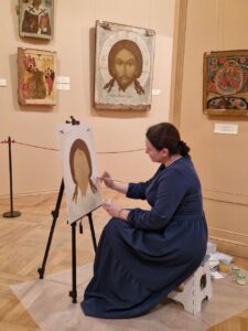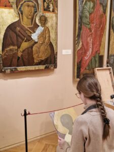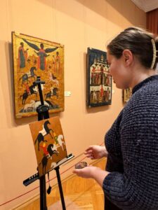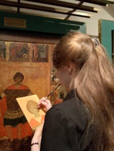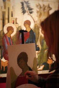 Две студентки 4 курса проходят иконописную практику в Центральном музее Древнерусской культуры имени преподобного Андрея Рублева: Сибиль Анастасия копирует фрагмент иконы «Живоначальная Троица» (Тверь, конец XV — начало XVI вв.); Найдыш Мария пишет лик святого пророка Иоанна Предтечи (Москва, 1560-е гг.).