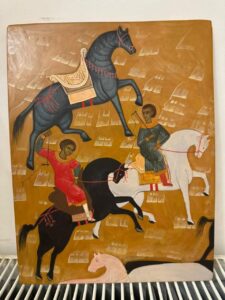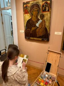 Три воспитанницы 4-го и 3-го курса были направлены на прохождение копийной практики в Смоленский государственный музей-заповедник. Курбенко Елена копирует икону «Спас Нерукотворный» (Псков, XV в.), Дубатолкина Мария пишет фрагмент иконы «Чудо о Флоре и Лавре» (XVII в.), Гусан Полина копирует лик Богомладенца с иконы «Богоматерь Одигитрия Смоленская» (XVII в.).