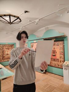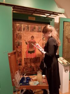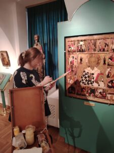 Четыре студента 2,3 и 4 курсов отделения «Живопись» (Иконописное) проходят иконописную практику в Калужском музее изобразительных искусств. Иконы, выбранные студентами для копийной работы: Святитель Николай с житием (третья четверть XVI в.), Св. Георгий Победоносец с житием (Московская школа, около 1600 г.), Св. Димитрий Царевич (Московская школа, около 1600 г.), Петровская икона Божией Матери (Московская школа, около 1690 г.).