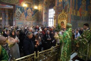 По окончании Литургии архипастырь окропил собравшихся святой водой и обратился с проповедью: