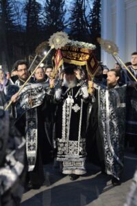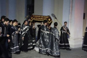 После Великого славословия был совершен крестный ход с Плащаницей вокруг собора.