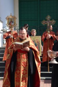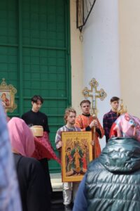 По окончании Литургии вокруг храма был совершен пасхальный крестный ход с чтением Евангелия и кроплением верующих святой водой.