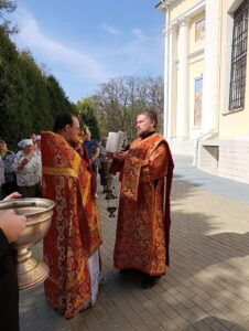 По окончании Литургии вокруг храма был совершен пасхальный крестный ход с чтением Евангелия и кроплением верующих святой водой.