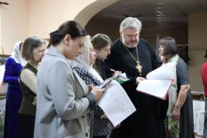Просмотр начался с общей молитвы «Царю Небесный…». Далее к преподавателям и студентам с приветственным словом обратился ректор Духовного училища протоиерей Иоанн. Он поблагодарил преподавателей и учащихся за труды и пожелал всем помощи Божией в завершении учебного года и дальнейшего возрастания в профессиональном мастерстве.