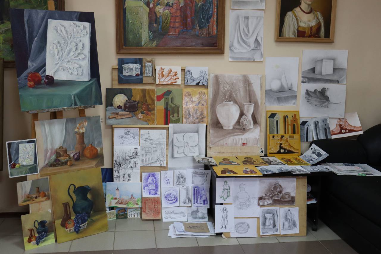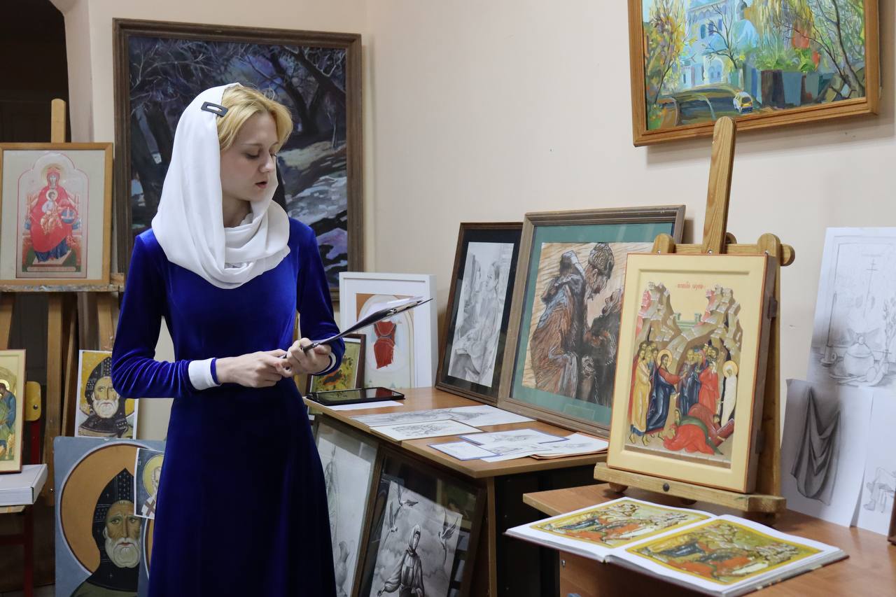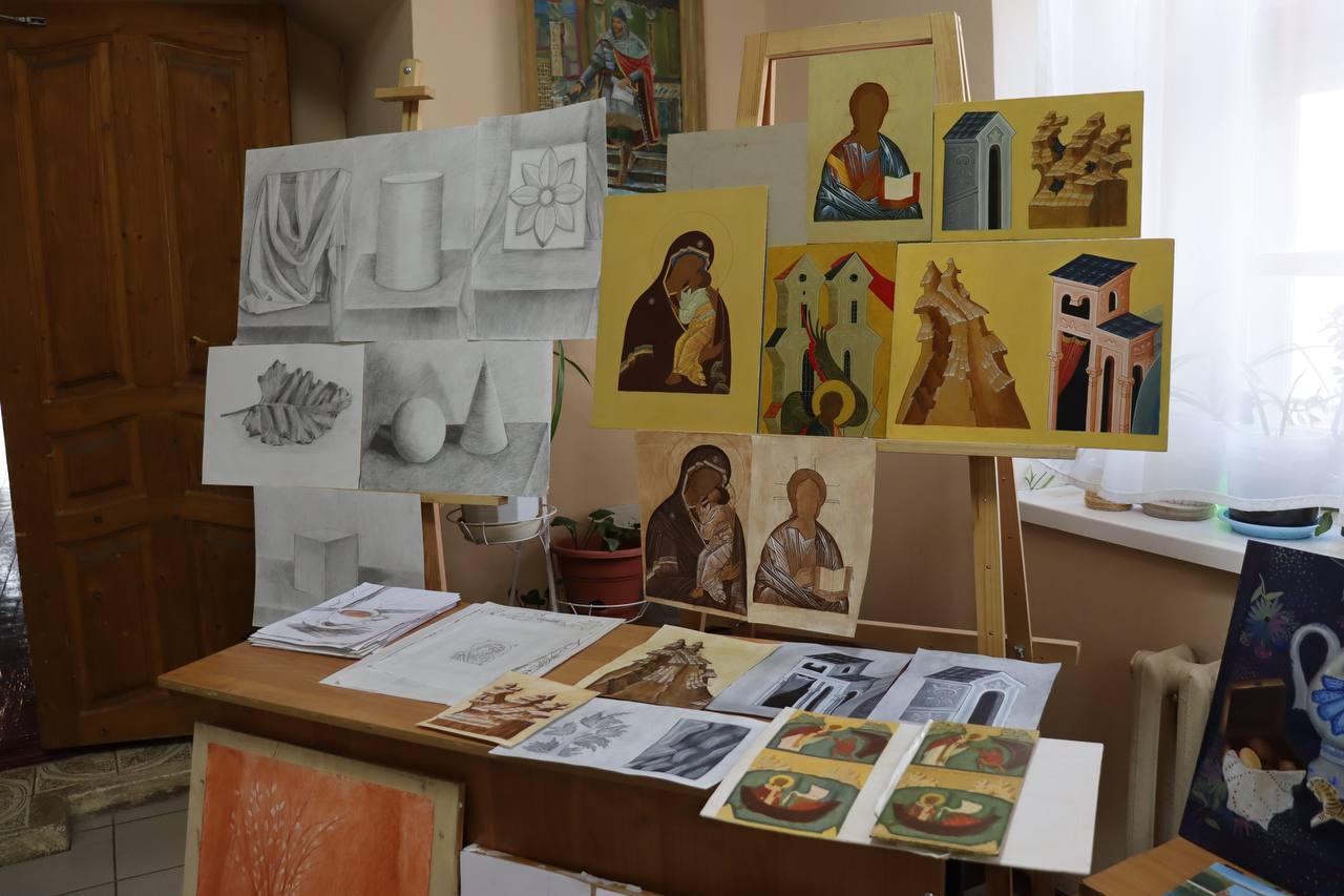 На просмотре были представлены работы студентов всех курсов, выполненные в разных техниках, по следующим предметам: «Иконописание», «Живопись», «Рисунок», «Композиция», «Каллиграфия и шрифт», «Пластическая анатомия», «Основы реставрации» и «Основы стенописи».