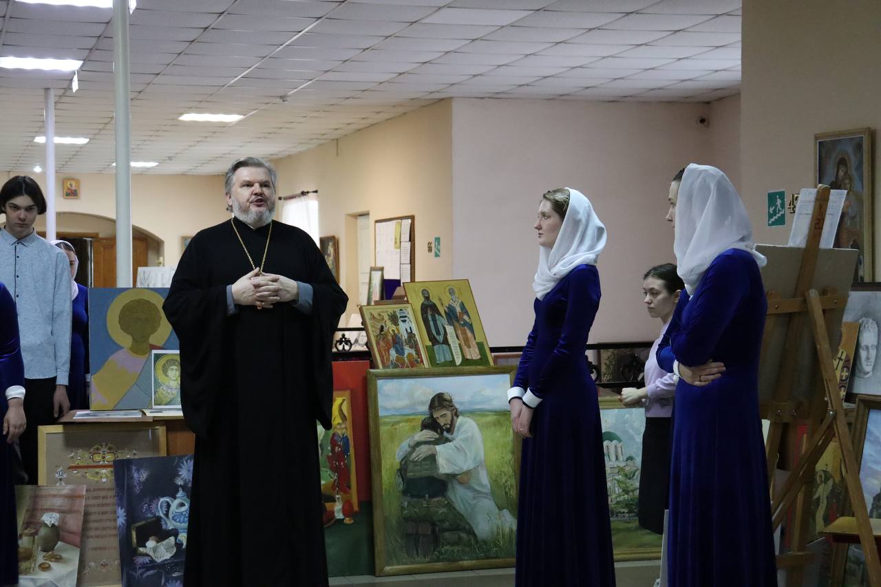 Просмотр начался с общей молитвы «Царю Небесный…». Далее к преподавателям и студентам с приветственным словом обратился ректор Духовного училища протоиерей Иоанн. Он поблагодарил преподавателей и учащихся за труды и пожелал всем помощи Божией в завершении учебного года и дальнейшего возрастания в профессиональном мастерстве.