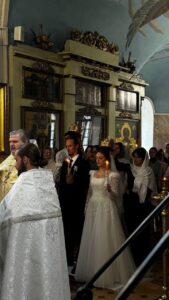Венчание возглавил настоятель храма протоиерей Иоанн Паюл в сослужении иерея Михаила Калиничева и иерея Тимофея Вишнякова.