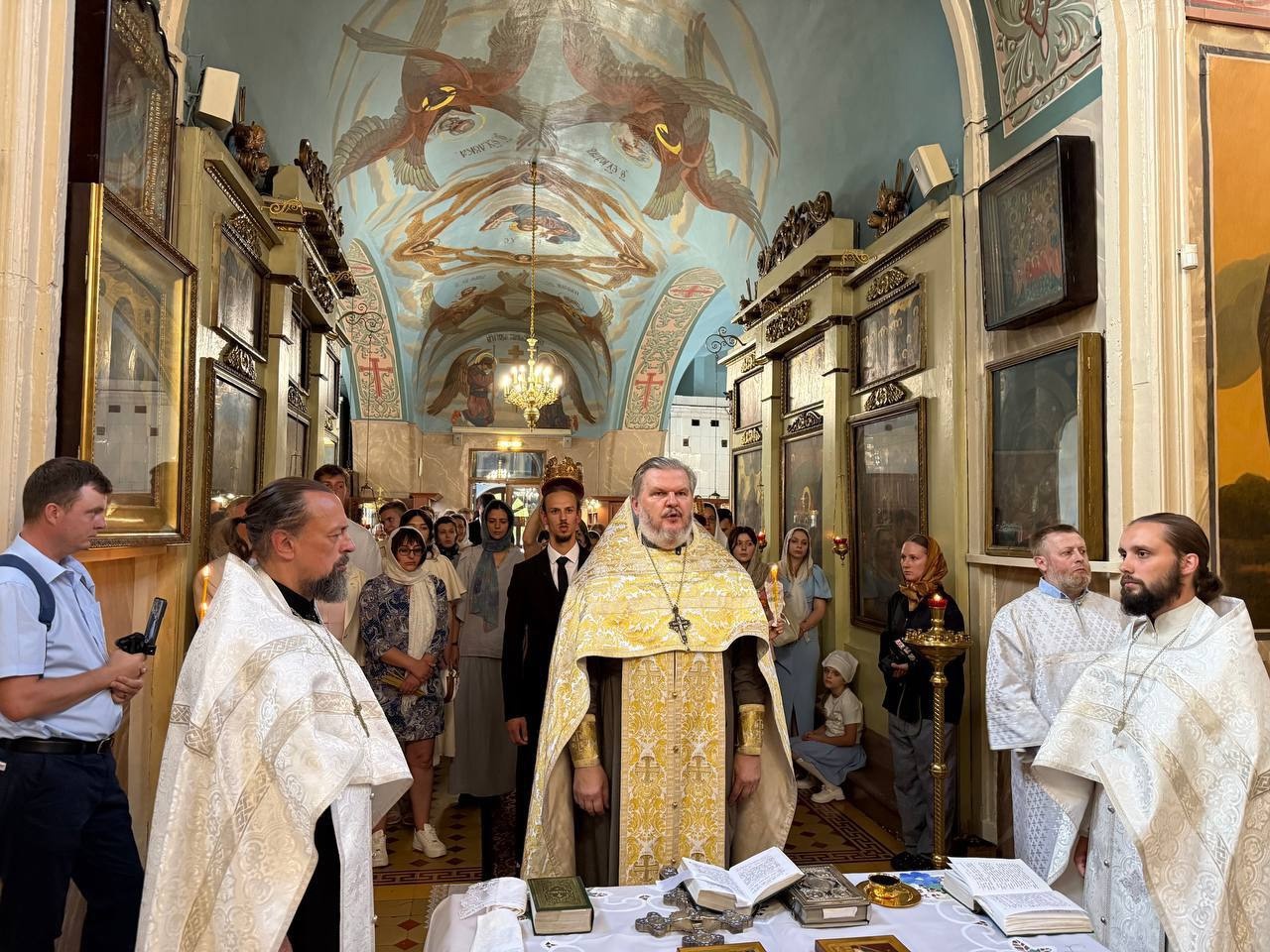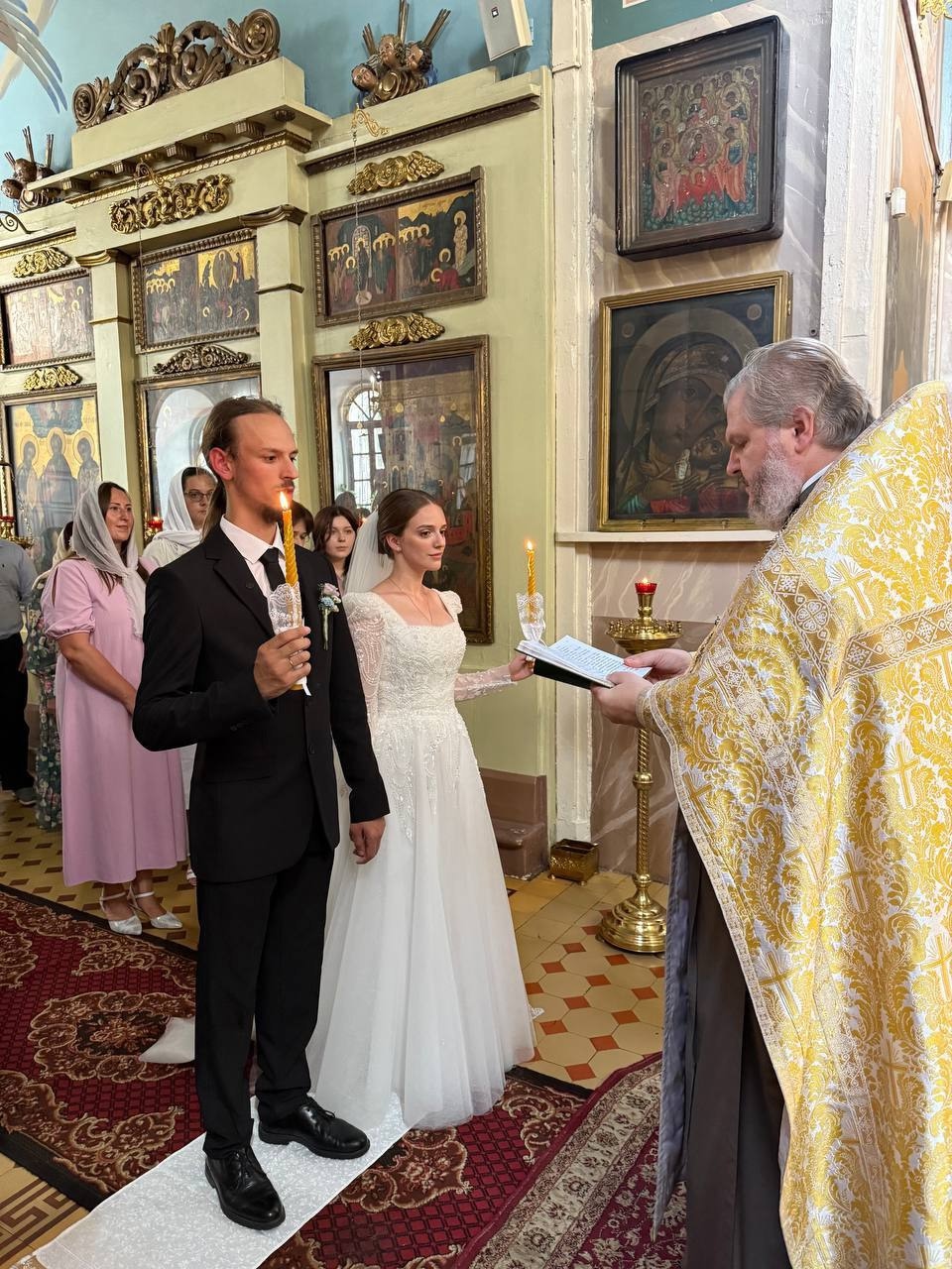 Венчание возглавил настоятель храма протоиерей Иоанн Паюл в сослужении иерея Михаила Калиничева и иерея Тимофея Вишнякова.