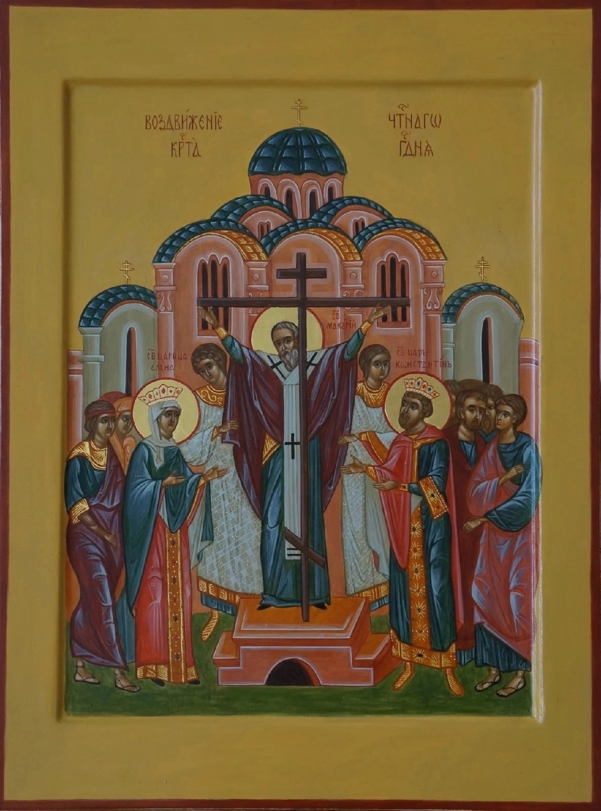 Раскопки было решено проводить рядом с Голгофой, так как у иудеев был обычай закапывать орудия казни рядом с местом ее совершения. И, действительно, в земле нашли три креста, гвозди и доску, что была прибита надо головой распятого Спасителя. Как говорит Предание, к одному из крестов прикоснулся болящий человек и исцелился. Так император Константин и царица Елена узнали, какой из крестов — тот самый. Они поклонились святыне, а затем патриарх Иерусалимский Макарий стал показывать ее народу. Для этого он встал на возвышение и поднимал («воздвигал») Крест. Люди поклонялись Кресту и молились: «Господи, помилуй!».