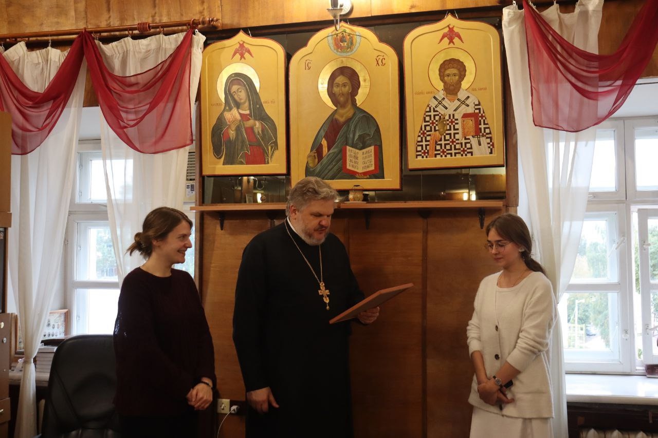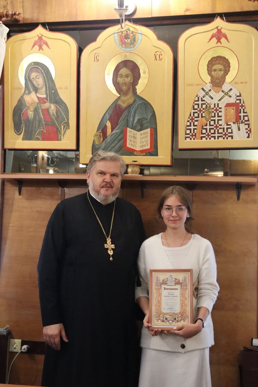 Кроме того, воспитанница IV курса Анастасия Пригоцкая была удостоена благодарности за активное участие в общественной жизни училища. Ректор тепло поблагодарил её за добросовестный труд в организации и подготовке выставок, которые училище проводит как в стенах Калужского духовного училища, так и вне учебного заведения.