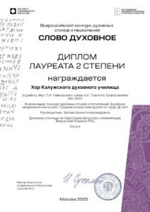 • Хор Калужского духовного училища — музыка П.И. Чайковского, слова А.К. Толстого, «Благословляю вас, леса» — Лауреат 2 степени (регент: Зотова И.А.).