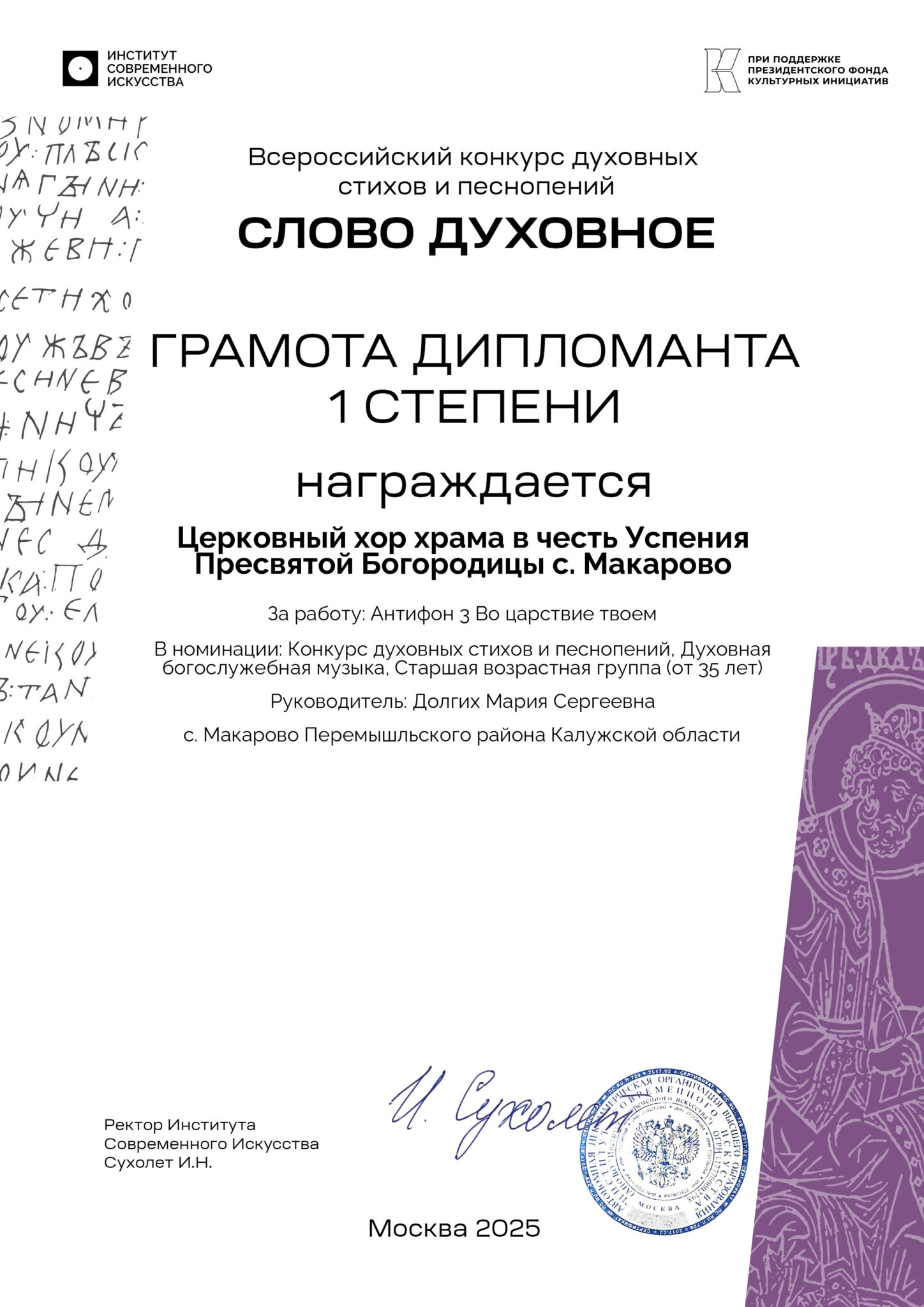 • Церковный хор храма в честь Успения Пресвятой Богородицы с. Макарово — «Антифон 3 Во царствие твоем» — Дипломант 1 степени (регент: Долгих М.С.).