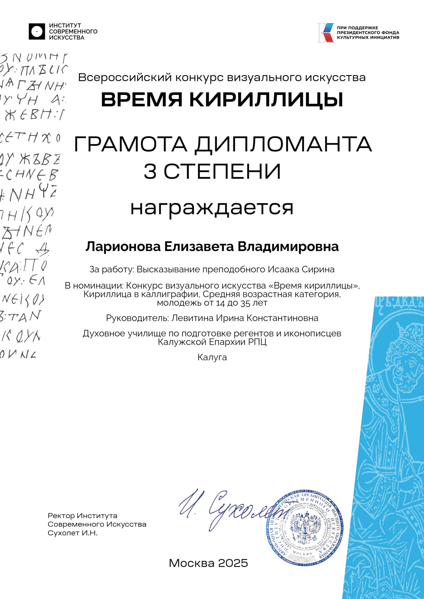 • Ларионова Елизавета Владимировна — «Высказывание преподобного Исаака Сирина» — Дипломант 3 степени.