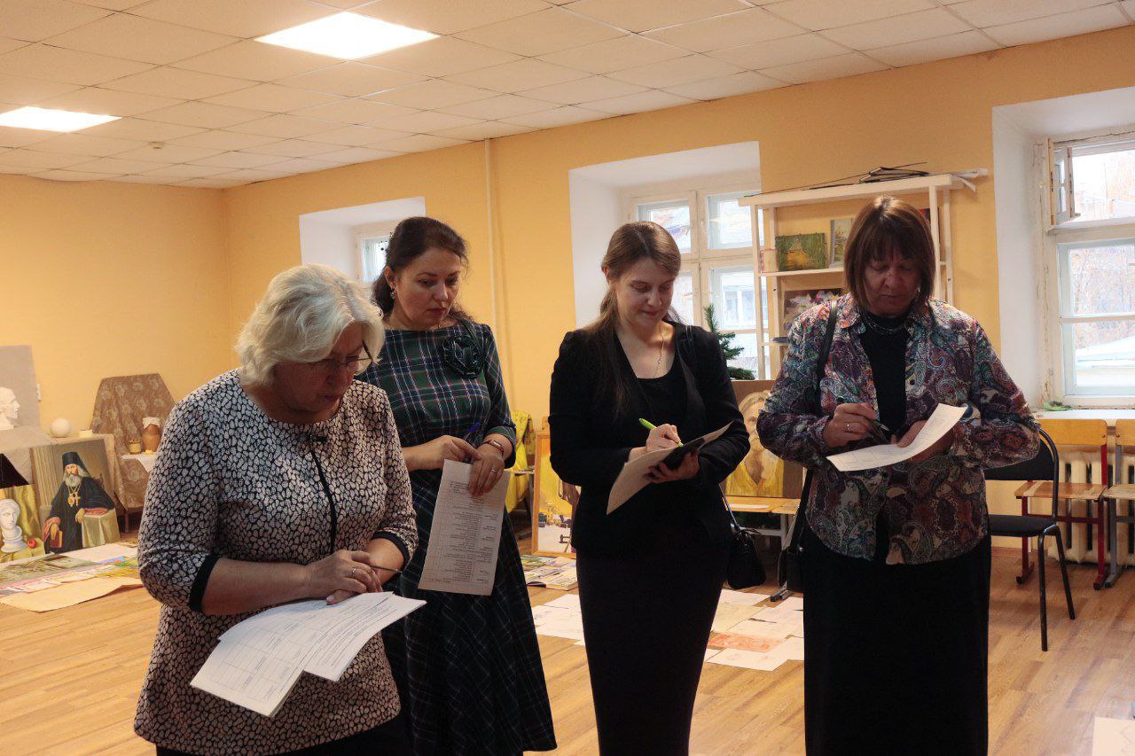 На просмотре присутствовали проректор по учебной работе — Чеппель М.А., заведующий отделением «Живопись» (Иконописное) — Казакова Л.В., методист Коркина Л.Н., преподаватели творческих дисциплин: Алексеева А.П., Левитина И.К. и Чистоусов Е.В.