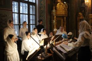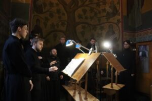 Богослужебные песнопения исполнил хор Калужской духовной семинарии под управлением воспитанника IV курса Карпенко Ивана и хор Калужского духовного училища под управлением воспитанницы III курса Ремешевской Анастасии.