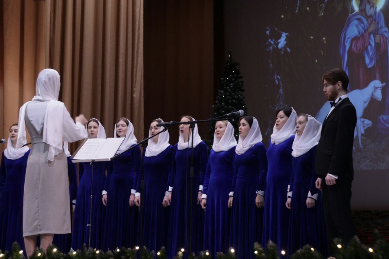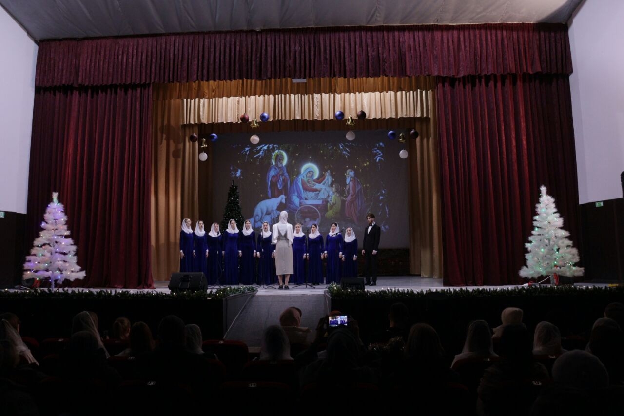 Вокально-хоровой ансамбль Калужского духовного училища под управлением преподавателя училища Морарь Марии Витальевны исполнил рождественские колядки и духовные песнопения.