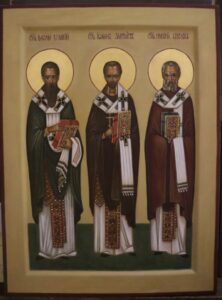 Сказав это епископу, они стали подниматься на небо, сияя неизреченным светом и называя друг друга по имени. Блаженный епископ Иоанн тотчас своими стараниями восстановил мир между враждовавшими, так как он был муж великий в добродетели и знаменитый в любомудрии. Он установил праздник трех святителей, как и повелели ему святые, и завещал церквам праздновать его с подобающим торжеством. В этом ясно обнаружилась мудрость сего великого мужа, так как он усмотрел, что в январе совершается память всех трех святителей, а именно: в первый день — Василия Великого, в двадцать пятый — божественного Григория, а в двадцать седьмой — святого Златоуста, — то он соединил их в тридцатый день того же месяца, увенчав празднование их памяти канонами, тропарями и похвалами, как это и приличествовало.