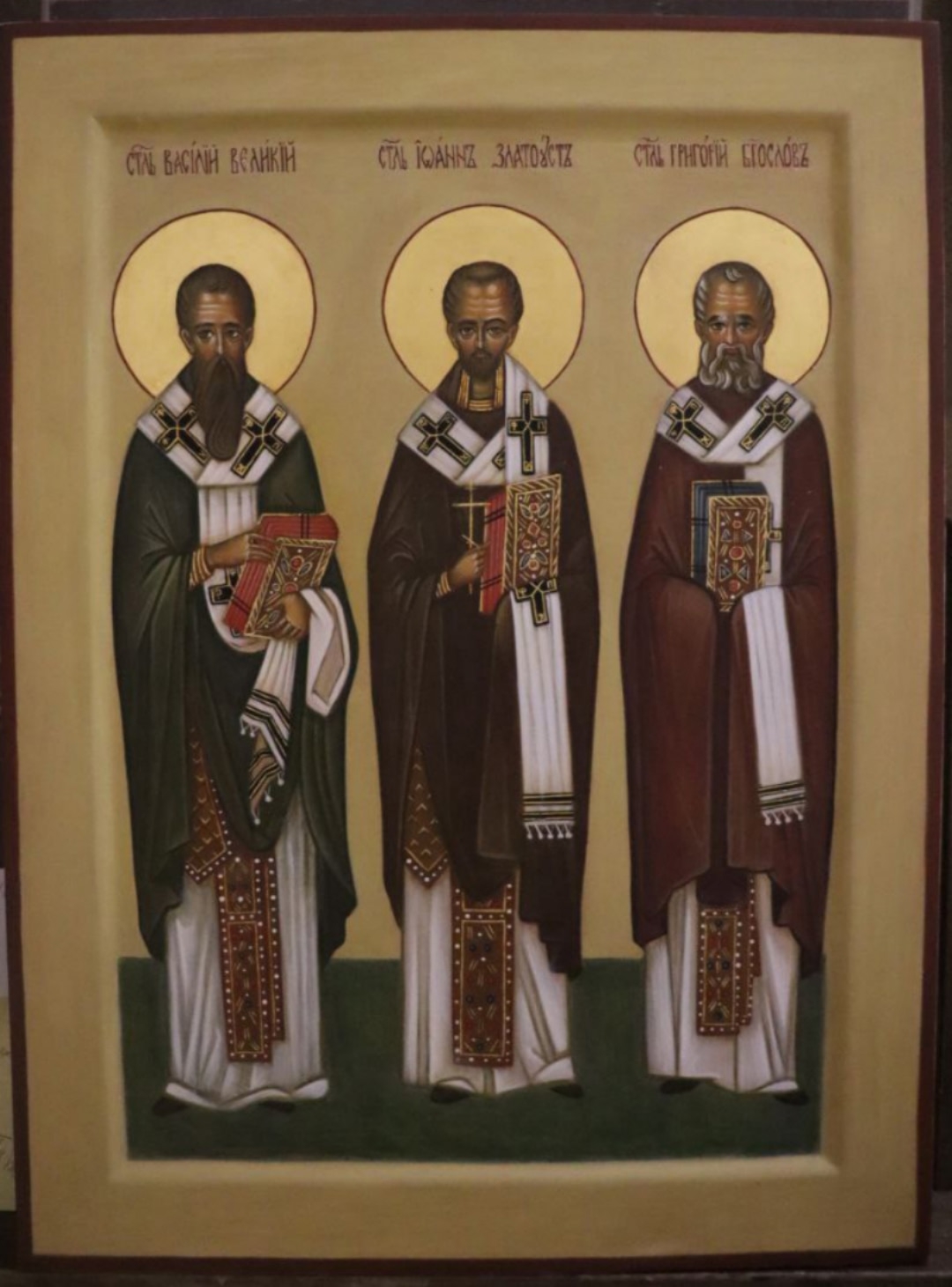 Сказав это епископу, они стали подниматься на небо, сияя неизреченным светом и называя друг друга по имени. Блаженный епископ Иоанн тотчас своими стараниями восстановил мир между враждовавшими, так как он был муж великий в добродетели и знаменитый в любомудрии. Он установил праздник трех святителей, как и повелели ему святые, и завещал церквам праздновать его с подобающим торжеством. В этом ясно обнаружилась мудрость сего великого мужа, так как он усмотрел, что в январе совершается память всех трех святителей, а именно: в первый день — Василия Великого, в двадцать пятый — божественного Григория, а в двадцать седьмой — святого Златоуста, — то он соединил их в тридцатый день того же месяца, увенчав празднование их памяти канонами, тропарями и похвалами, как это и приличествовало.