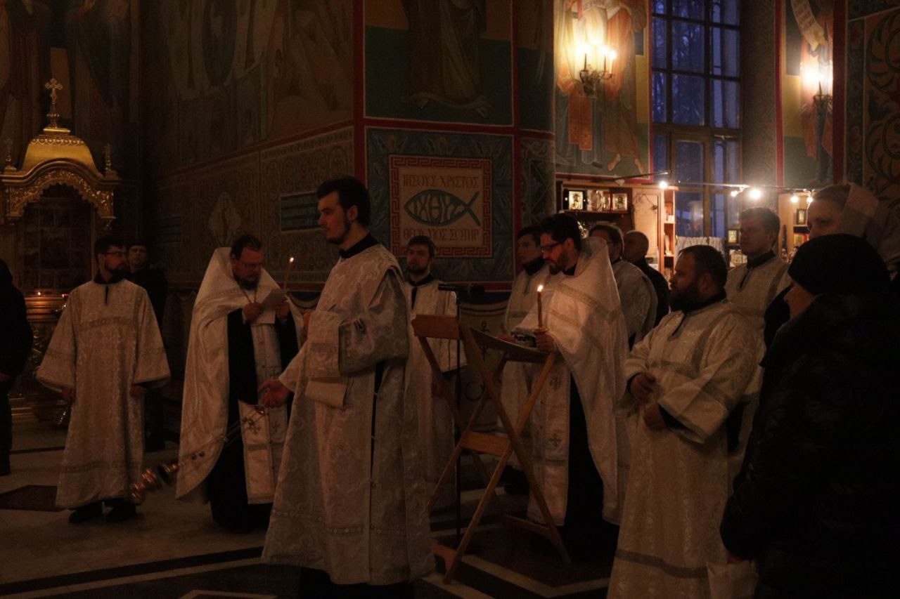 13 февраля 2026 года в канун Вселенской родительской субботы в Свято-Троицком кафедральном соборе города Калуги было совершено вечернее богослужение, которое возглавил ключарь собора иерей Максим Лихонин.