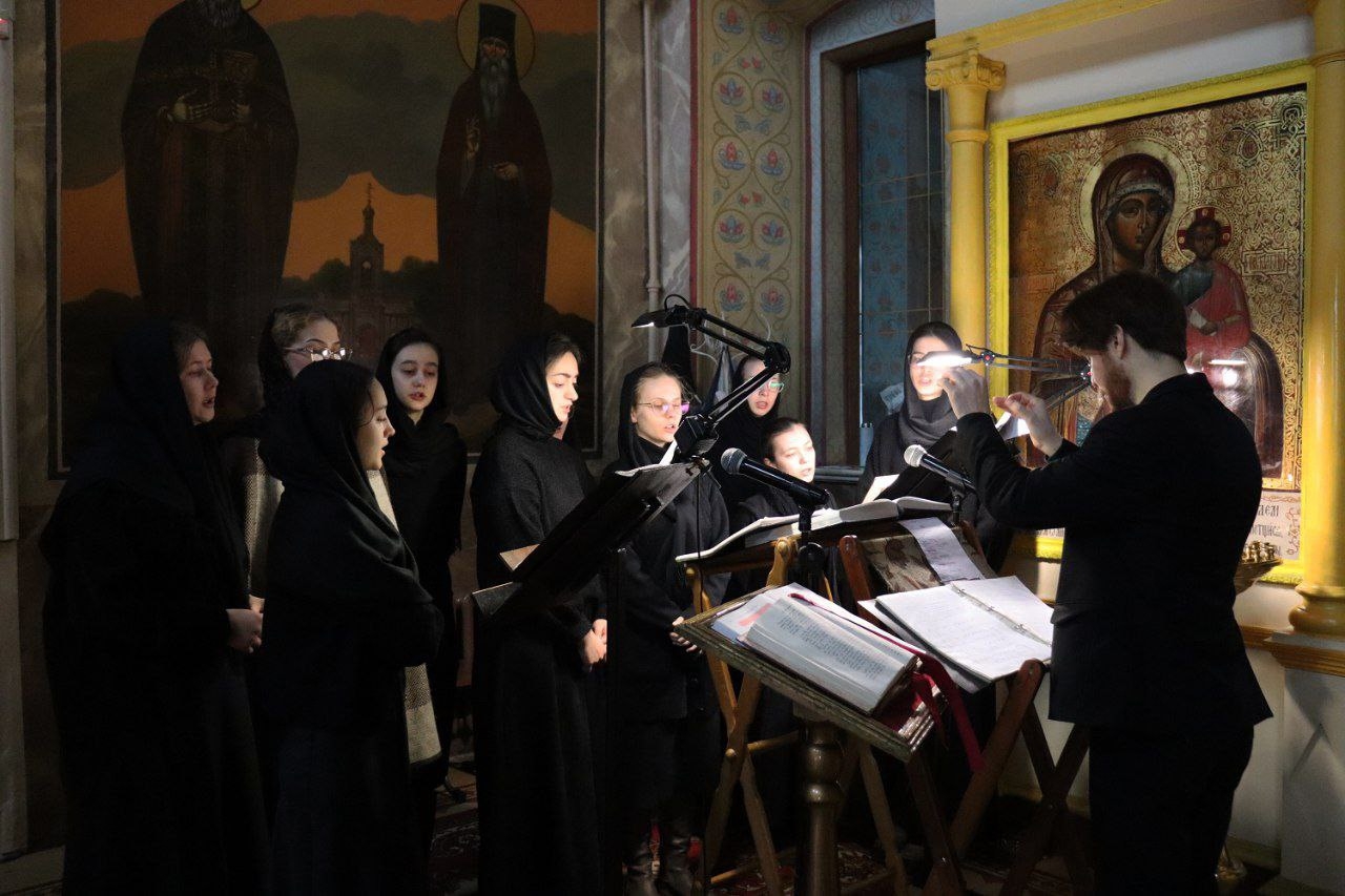Богослужебные песнопения исполняли: приходской хор храма под руководством Межуевой Ольги Ивановны и студенты Калужского духовного училища под руководством воспитанника III курса Васильева Пантелеймона.