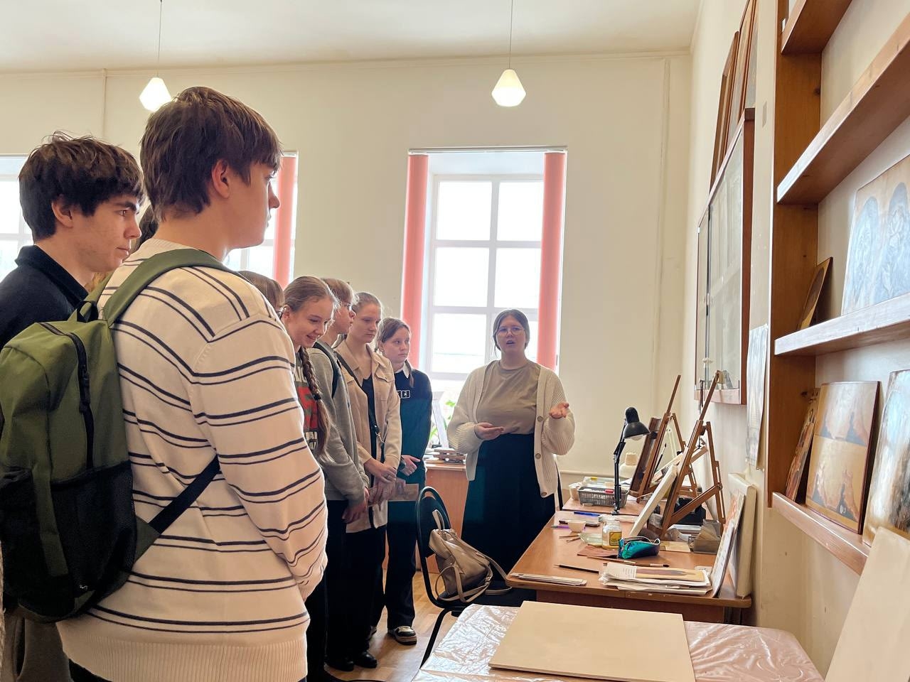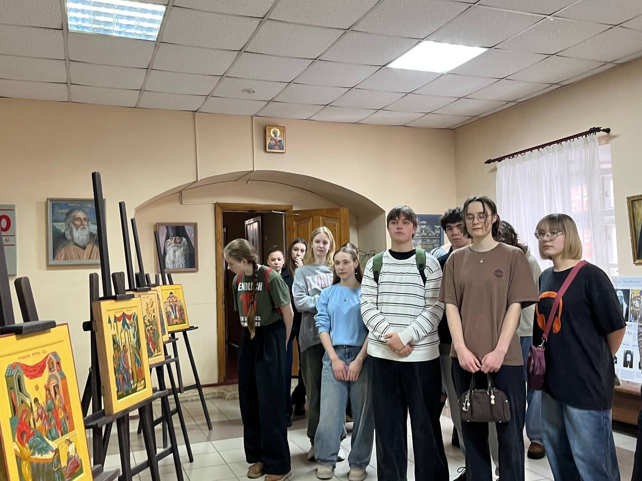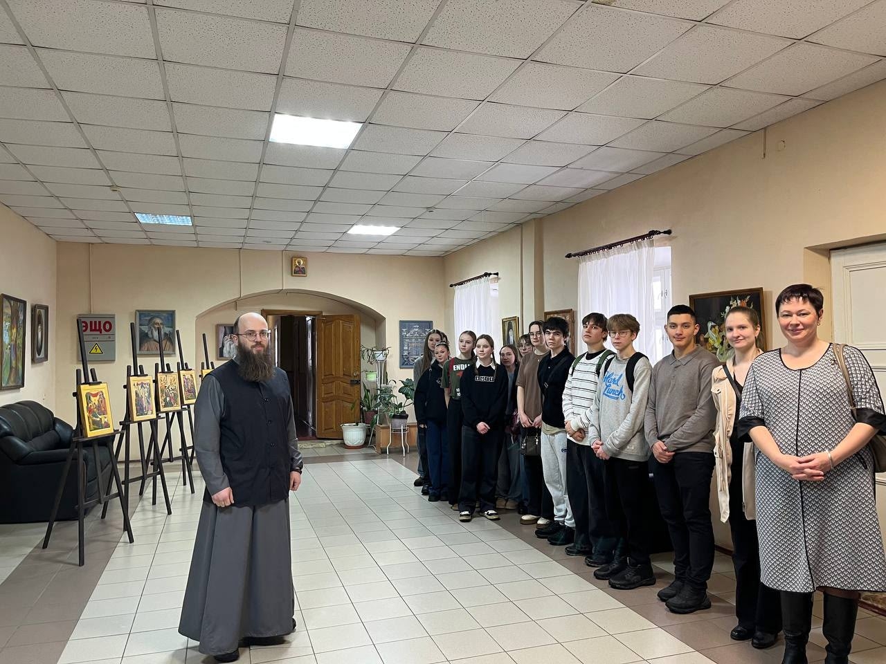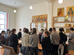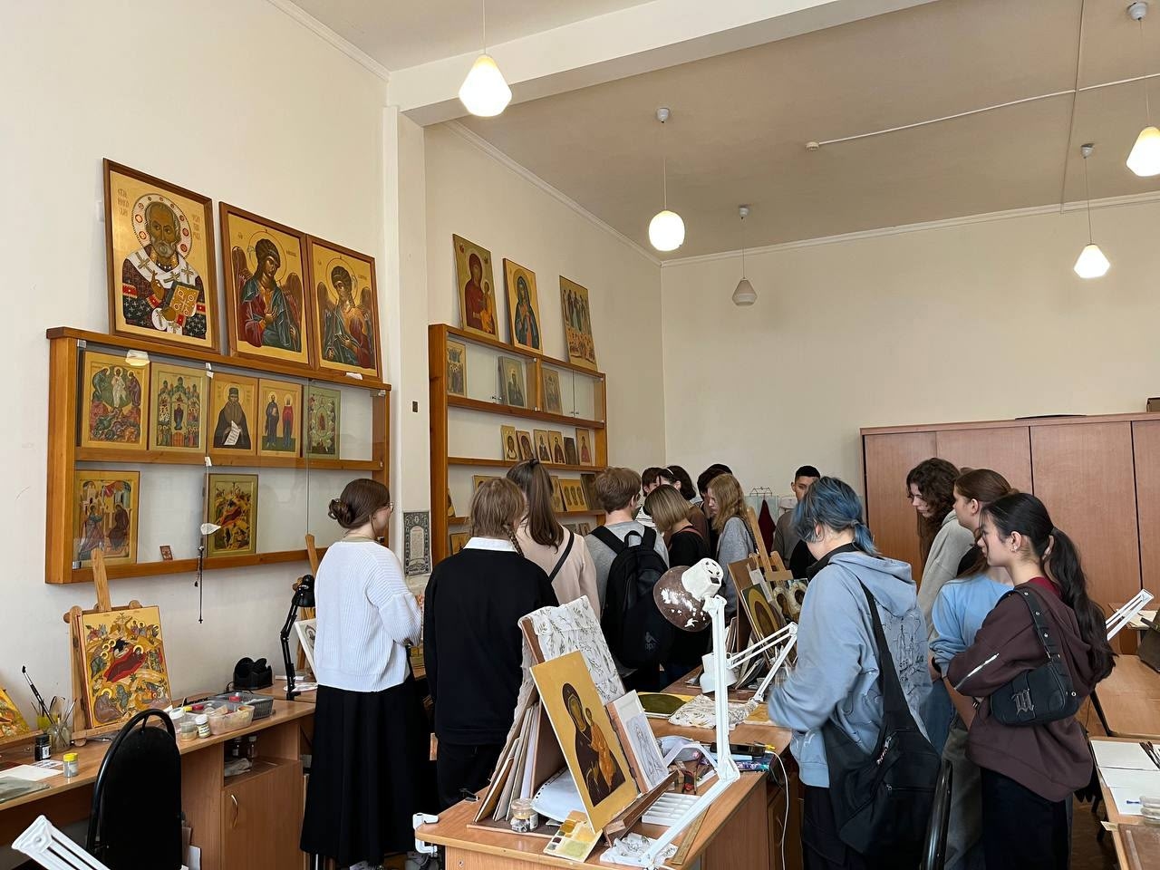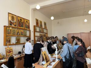 4 марта 2026 года проректор по учебной работе Чеппель Мария Анатольевна и воспитанница III курса отделения «Живопись» (Иконописное) Галуцких Ефросиния провели увлекательную экскурсию по иконописной мастерской для учеников 10 Б класса МБОУ «СОШ №5» г. Калуги, возглавляемой иереем Ильей Потемкиным. Во время экскурсии они не только познакомила гостей с тонкостями иконописи, но и рассказала о богатой истории и традициях Калужского духовного училища. Учащиеся с интересом слушали о процессе создания икон, а также о значении духовного образования в современном мире.