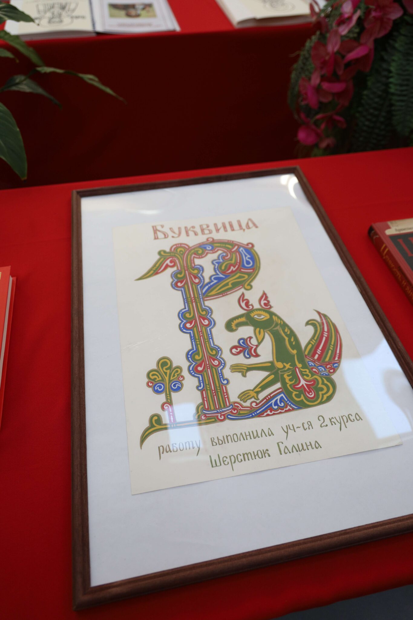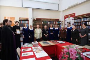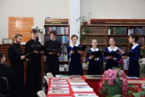 Перед началом мероприятия гости осмотрели выставку икон и живописных работ иконописного отделения Калужского духовного училища, организованную в рамках Недели православной книги. На экспозиции были представлены работы студентов по каллиграфии: тропари и кондаки, молитвы и другие фрагменты богослужебных текстов. Центральное место заняла картина святого Нестора Летописца. Экскурсию по выставке провела воспитанница IV курса отделения «Живопись»(Иконописное) Пригоцкая Анастасия.