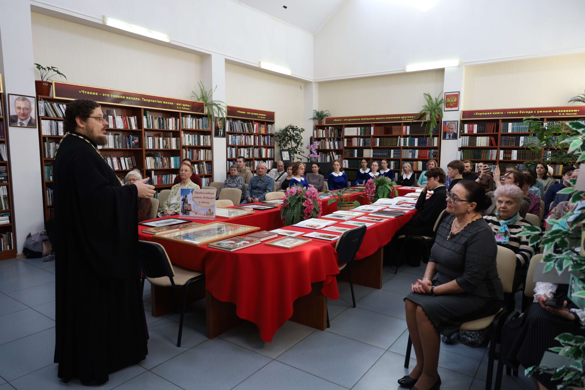 Со вступительным словом выступила директор библиотеки М. П. Коновалова. Она отметила, что спецбиблиотека для человека с инвалидностью — это центр информации, и подчеркнула важность подбора качественной литературы, в том числе православной тематики, для пользователей. Далее присутствующих приветствовал ректор Калужской духовной семинарии протоиерей Сергий Третьяков. Он рассказал об истории установления празднования Дня православной книги и значении духовной литературы в жизни человека. В преддверии Недели Крестопоклонной отец Сергий прочитал лекцию «О крестоношении» и передал библиотеке комплект книг духовного содержания.