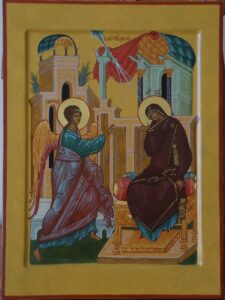 Ангел явился в дом праведного Иосифа, когда Мария читала Священное Писание и, вошел к Ней, сказал: «радуйся благодатная! (то есть исполненная благодати Божией – даров Святого Духа). Господь с Тобою! Благословенна Ты между женами».