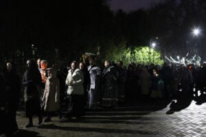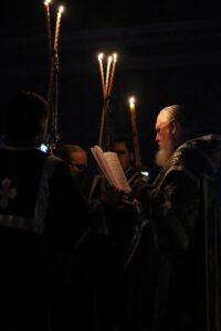 Затем перед Плащаницей были прочитаны пророчество о воскресении из книги пророка Иезекииля о всеобщем воскресении, чтение из Апостола об искупительной Жертве, принесенной Христом). Его Высокопреосвященство прочитал евангельское зачало о запечатании гроба Господня и приставлении к нему стражи.