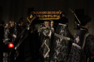 В конце богослужения Владыка и духовенство совершили поклонение перед Плащаницей Спасителя.