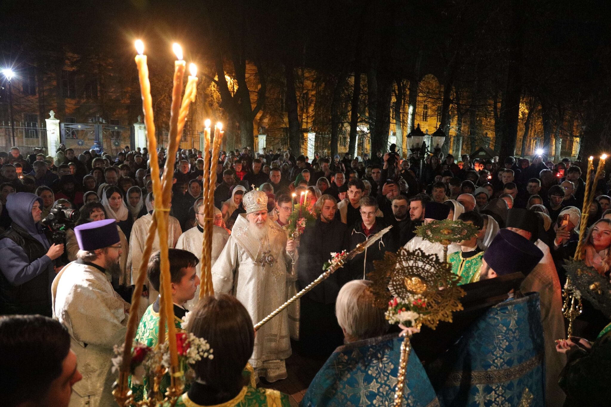 Традиционно на богослужение из Храма Воскресения Христова (Гроба Господня) в Иерусалиме был принесен благодатный огонь. Любой желающий мог зажечь от него свечу и принести частичку благодатного огня к себе домой.