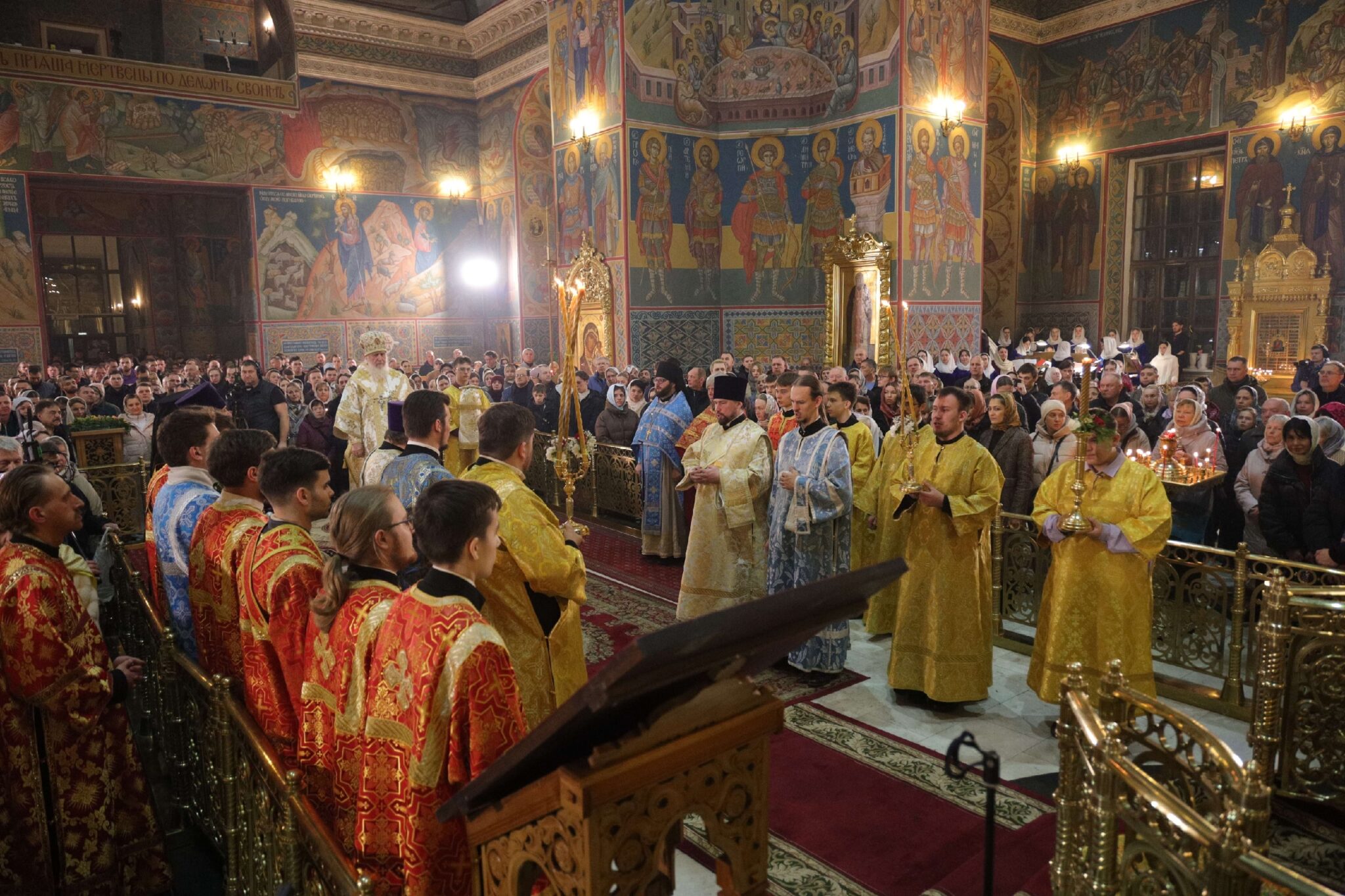 Под пение стихиры «Воскресение Твое, Христе Спасе» духовенство и богомольцы совершили крестный ход вокруг Свято-Троицкого кафедрального собора.