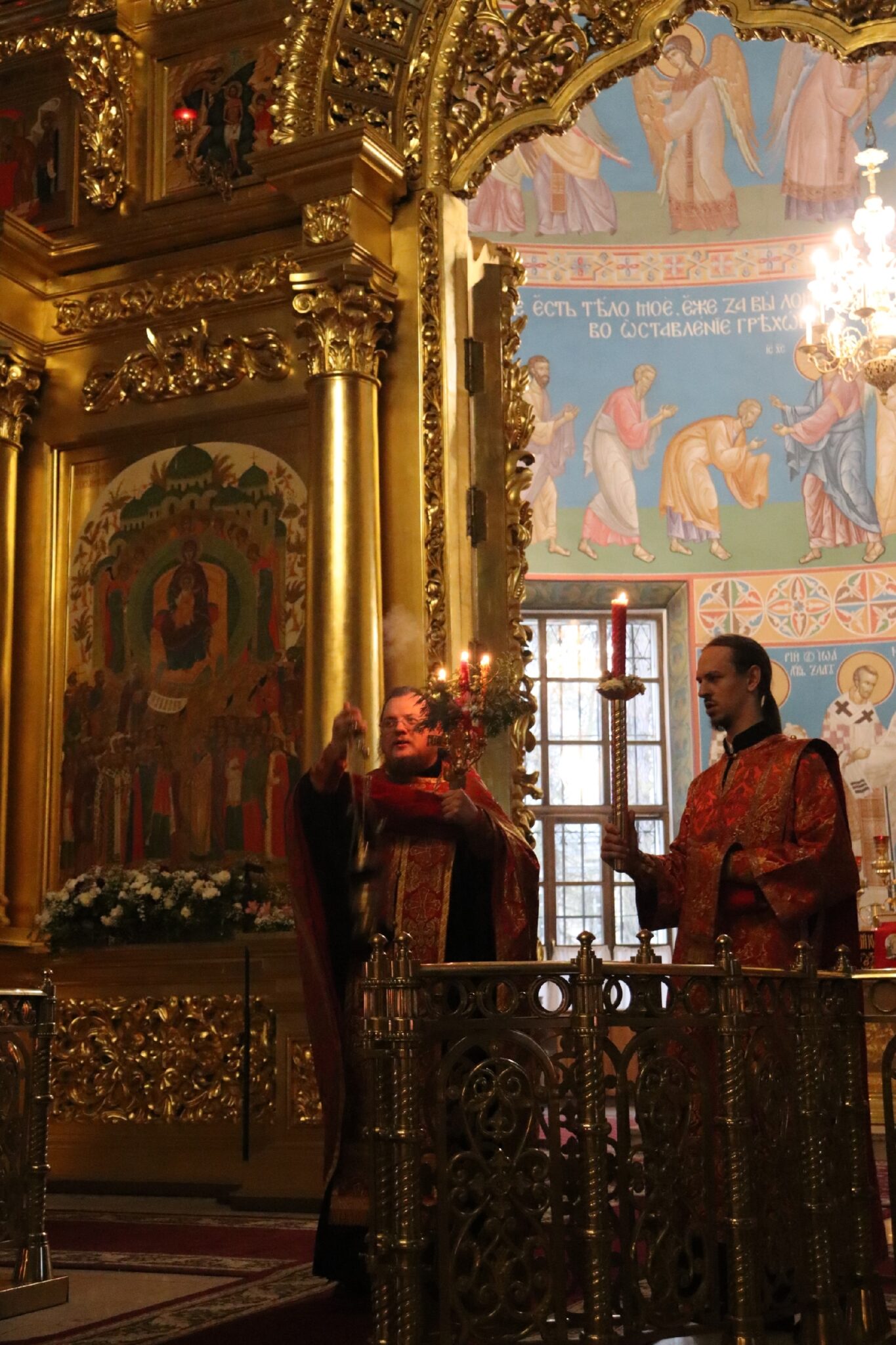 15 апреля 2026 года в канун Четверга Светлой седмицы в Свято-Троицком кафедральном соборе города Калуги было совершено вечернее богослужение, которое возглавил иеромонах Феофан (Сурин).